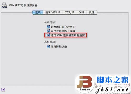 高级选项,注意看到那个红色框框内的,要勾上“通过VPN连接发送所有通信” ,然后点“好”。 然后 开始 “连接”。 连接成功后,在上图的左边,VPN的连接便呈现绿灯了