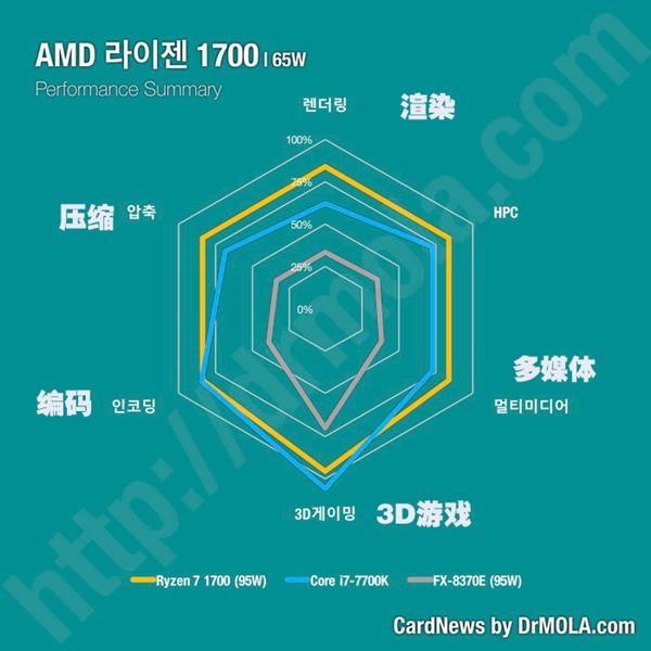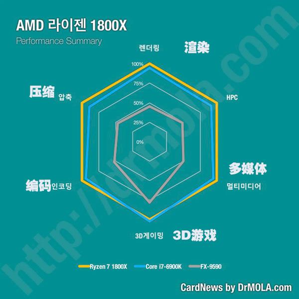 图表中使用的是韩文,不过Reddit网站上已经有热心群众给大家做了注释,最上方开始沿逆时针方向分别是渲染、压缩、编码、3D游戏、多媒体、HPC(计算性能)性能对比。了解测试内容之后,我们可以看到Ryzen 7 1800X全方位碾压前代旗舰FX-9590,号称世界首个5GHz处理器的它在后辈面前实在是没什么面子了,各方面的性能都大幅落后了。