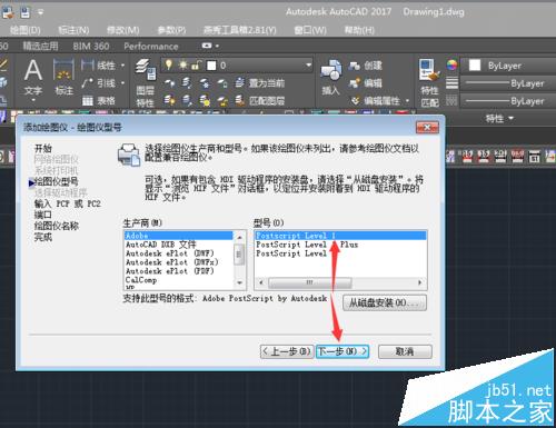 5、设备选Adobe公司的Postscript Level 1(默认的第一个)然后下一步;