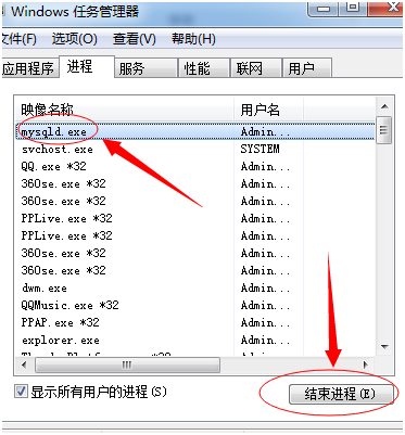 5. 看看那任务管理器中是否有mysqld.exe进程,如有,kill them all.