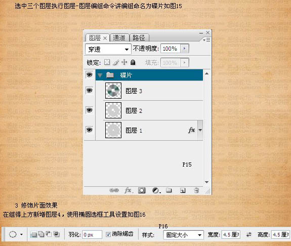 11、选中三个图层,执行:图层 > 图层编组命名,将编组命名为“碟片”,如下图。