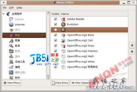 如果菜单中出现重复项,不能像windows里一样,直接删去,我们要启动Applications Menu Editor:应用程序->系统工具-> Applications Menu Editor,逐个删除重复项即可。如图六所示: