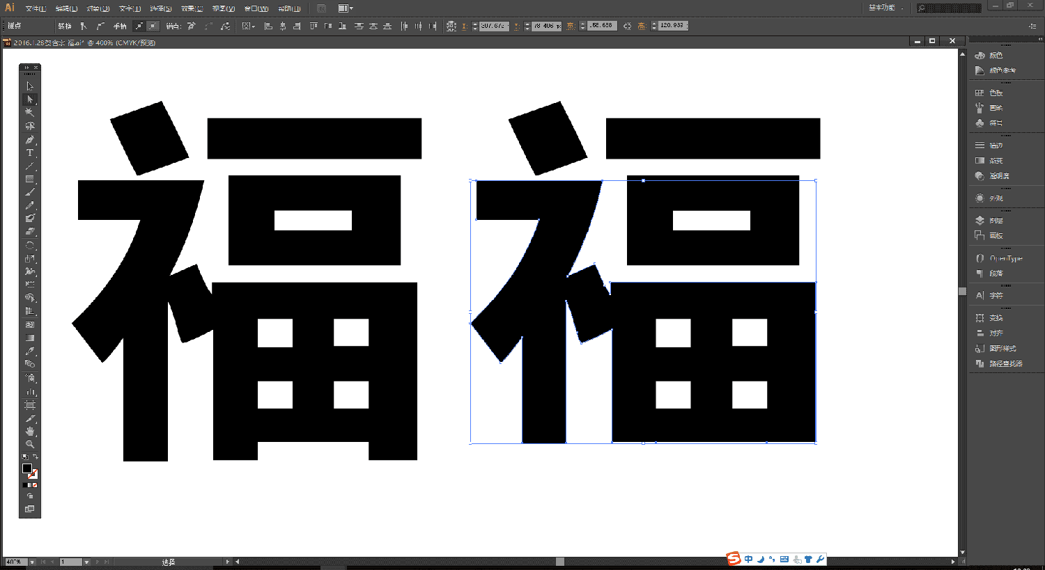 ↑步骤6:锁定立体福字模型,将备份的福字填充浅色,并降低透明度(便于观察描点重合),用直接选择工具(A)调节描点,直到完全和立体福字模型重叠;