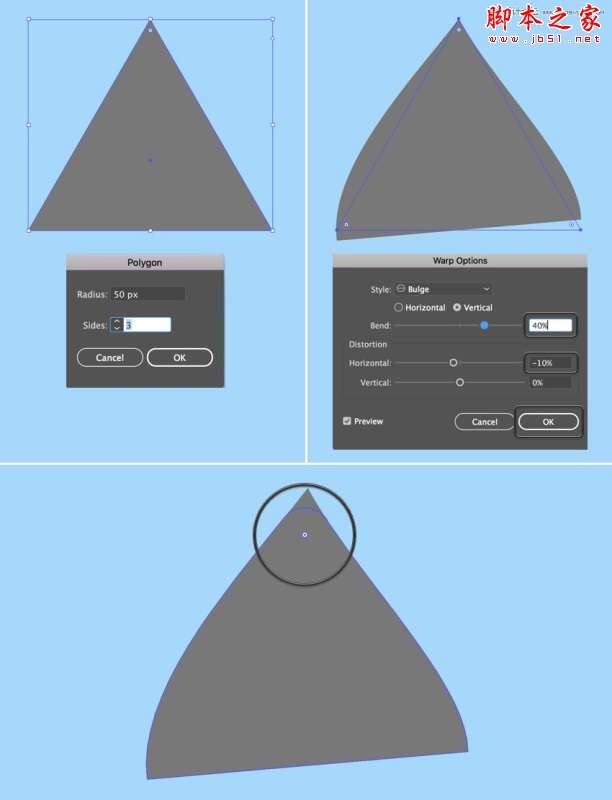 现在让我们改变形状,使它看起来更像一只耳朵。保持选择,转到效果>变形>凸出并将垂直弯曲值设置为40%; 水平扭曲至-10%。 这样,我们的形状膨胀并向左弯曲。