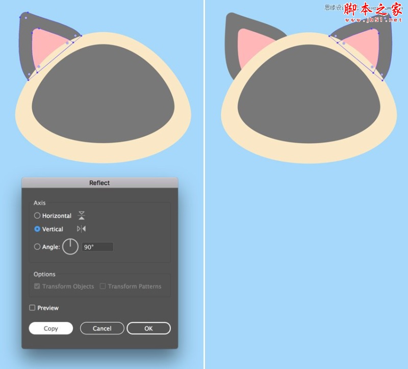 双击镜像工具(O) ,选择垂直轴,然后单击复制,创建耳朵的镜像副本。将其连接到头部的相对部分。