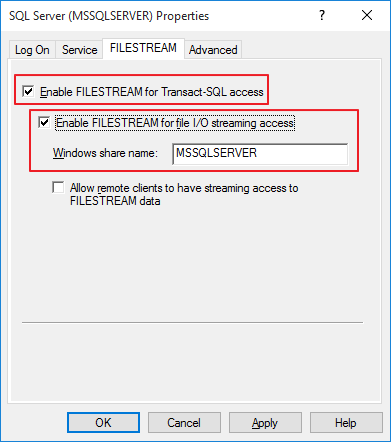--Create filestreamgroup ALTER DATABASE [Archive] ADD FILEGROUP [FileStreamGroup] CONTAINS FILESTREAM GO --Create filestream and association with filestreamgroup above ALTER DATABASE [Archive] ADD FILE ( NAME = N'FileStream', FILENAME = N'D:\Company\Data\SQL Server\FileStream') TO FILEGROUP [FileStreamGroup] GO