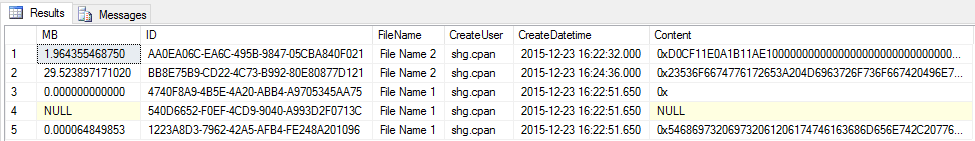 --Create table CREATE TABLE Archive.dbo.Attachment ( [ID] [UNIQUEIDENTIFIER] ROWGUIDCOL NOT NULL PRIMARY KEY, [FileName] NVARCHAR(100) NULL, [CreateUser] NVARCHAR(100) NULL, [CreateDatetime] DATETIME NULL, [Content] VARBINARY(MAX) FILESTREAM NULL ) FILESTREAM_ON [FileStreamGroup]