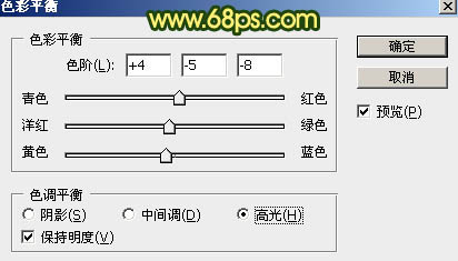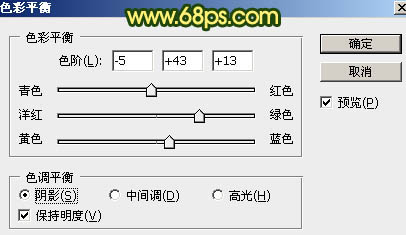 2、创建色彩平衡调整图层,对阴影、中间调、高光进行调整,参数设置如图5 - 7,确定后按Ctrl + Alt + G 创建剪切蒙版,效果如图8。这一步给图片暗部增加蓝绿色。