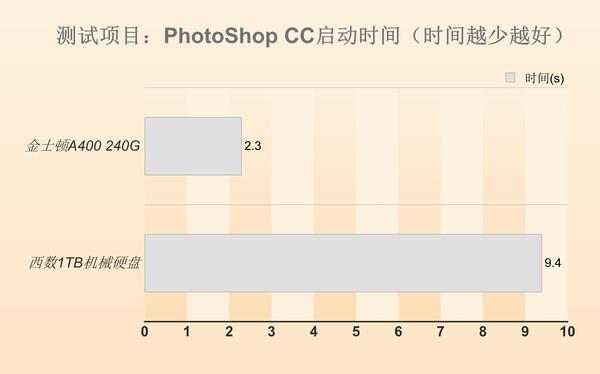 性能的差距可以明显反应在日常各种运用中,比如你开关机速度、、Photoshop软件开启,加载图片速度,金士顿A400 240G SSD都领先机械硬盘一大截。