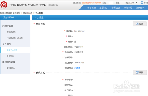 客运首页-我的12306-个人信息-查看个人信息:仔细核对每一项信息