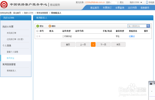 客运首页-我的12306-常用信息管理-常用联系人:仔细核对每一项信息,一般的注册用户基本就只有一个常用联系人,审核起来非常快捷