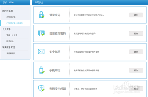 客户首页-我的12306-个人信息-账号安全:成功通过12306的身份核验后请完善注册账号的账号安全信息,进入客户首页-我的12306-个人信息-账号安全可修改登录密码,通过语音查询密码,修改安全邮箱,绑定手机,设置密码安全问题等操作,提示账户的安全性,保证个人信息安全