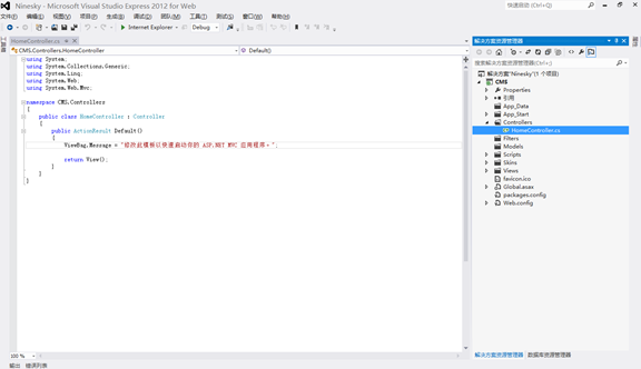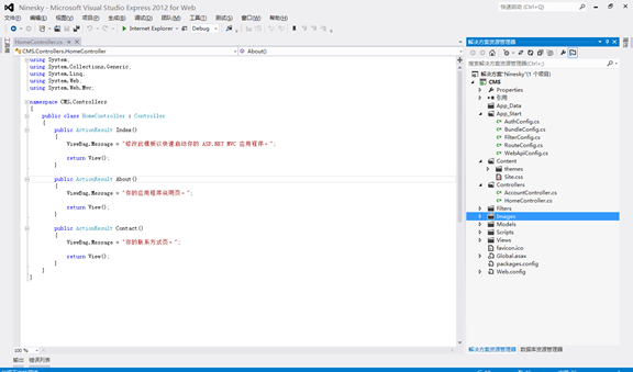 1、打开HomeController 将public ActionResult Index()改为 public ActionResult Default(),删除public ActionResult About()、public ActionResult Contact();