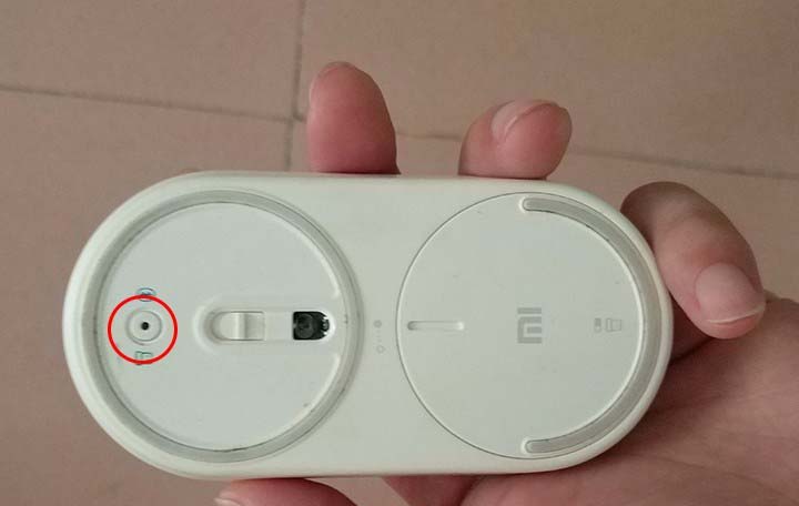 4、小米鼠标有一个切换转换的按钮,按下去绿光就是2.4g模式,蓝光就是蓝牙模式。采用两节AAA电池供电,由于属于非游戏鼠标还是比较节电的。