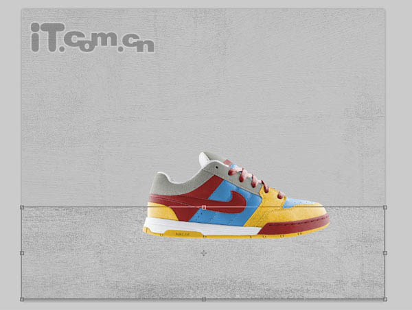 10、按下Ctrl+T进入自由变换状态,调整染料的大小、形状和位置,把它放在黄色的鞋底上,如图所示。