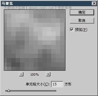 2、执行【滤镜_像素化_马赛克】,设定和图像效果分别如下两图。