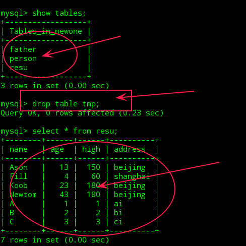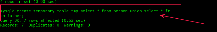 思考:①是否可以只用以下一个命令:>create table tmp select * from person union select *from father;来创建新表呢?
