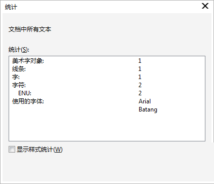 3、在下拉菜单中选择 文本统计信息,弹出对话框如下。我们发现还有美术字、字符、字等没有转曲线,我们怎样找到并进行转曲呢?