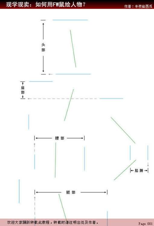 先将人物的位置动作、曲线用简单的线条勾勒出来。为了方便辨认,我们用两种颜色来区分。蓝色线为人物各部分位置,绿色线为人物动作走向。