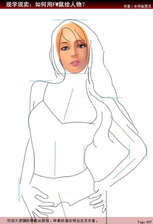 勾勒面部的基本线条。依靠绿色走向辅助线,将头发、脸型及五官的基本轮廓用“钢笔”工具画出。身体部分基本线条的勾勒,与面部方法相同,下文中我们不再赘述。
