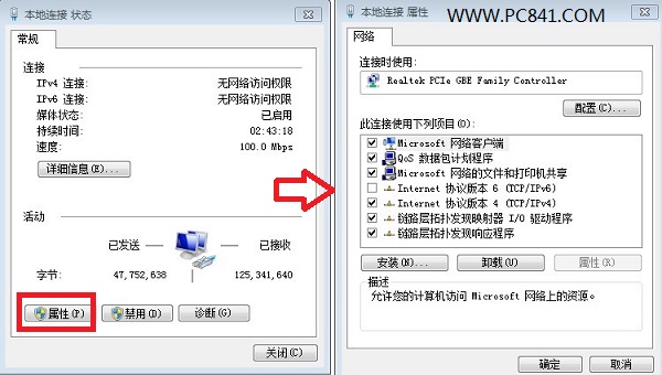 四、在本地连接状态对话框中,我们再选择“属性”,之后会再打开本地连接属性对话框,如下图所示:
