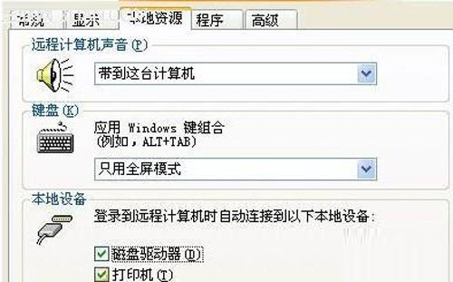首先在本地工作站系统桌面中依次单击windows7系统下载桌面的“开始”/“程序”/“远程桌面连接”命令,打开远程桌面连接程序界面,单击该界面中的“选项”按钮,并在其后弹出的选项设置窗口,单击“本地资源”标签,打开如图3所示的标签设置页面,选中其中的“磁盘驱动器”项目,再单击“连接”按钮,开始进行远程桌面连接;
