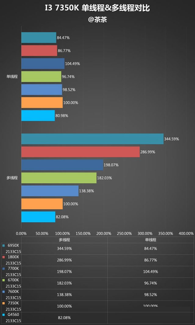 这张表的汇总会包含单线程和多线程性能,可以反应7350K的使用表现。7350K的性能大致会比4560高20%,会比7500低。至于跟1800X和6950X两位老大哥比较~~~呵呵