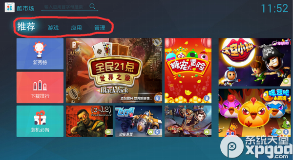 1.酷市场包含四个主要分类:推荐、游戏、应用和管理;