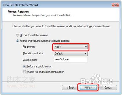 又进入到了“Format Partition”步骤。在此步骤中需要为新分区确定分区格式,我们当然是选择好用双稳定的“NTFS”格式的了,然后单击“Next”按钮: