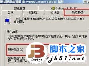 ⒌检查是否开启了硬件加速,如果开启看硬件加速,可能会占用摄像头程序,因此需要关闭硬件加速,方法为:在桌面空白的地方点击鼠标右键——>选择“属性”—— >弹出“显示属性”窗口后切换到“设置”选项卡中——>点击右下方的“高级”——>在点击“疑难解答”选项卡——>向左拉滑动条,将中间的“硬件加速(H)”调整为“无”——>点击确定退出;