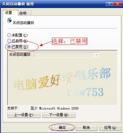 3.在弹出的关闭自动播放的属性框中,点选“已禁用”,并按“确定”。