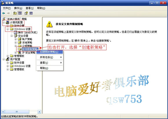 4.再回到左边的路径框中,选择“计算机配置”——“windows设置”——“安全设置”——右击“软件限制策略”,并选择“创建新的策略”。(第一次使用的时候,都右边会显示“没有定义”)