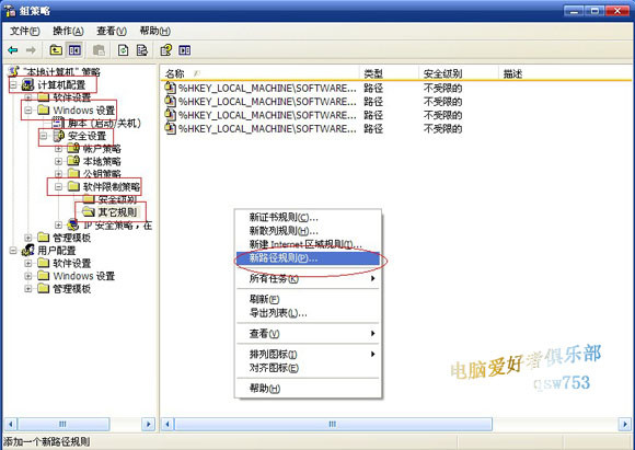 5. 创建成功后,在“软件限制策略”下面多了“安全级别”、“其它规则”。我们点选“其它规则”,并在右边的框中的白色部分,右击鼠标,并选择“新路径规则”。