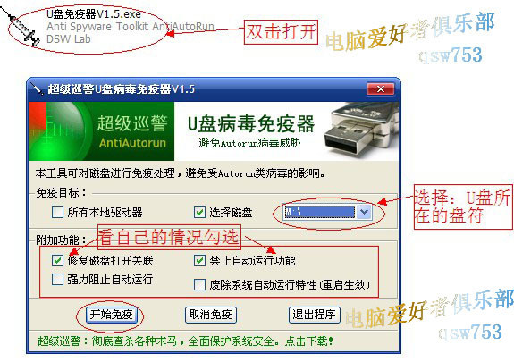 1.巧用免疫工具。(我在这里用的是“超级巡警U盘病毒免疫器”)