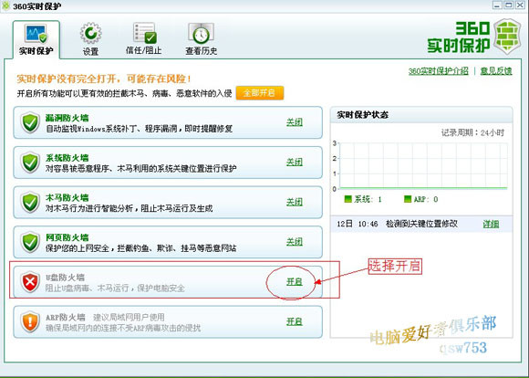 4. 在弹出的实时保护框中,找到“U盘防火墙”,并点击“启用”。