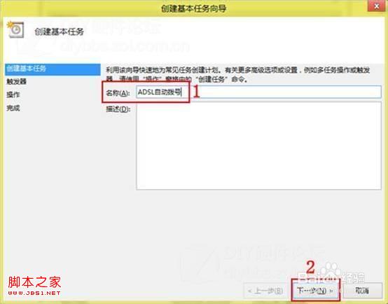 在弹出的创建基本任务向导对话框中,在下图标注“1”处键入任务名称如:ADSL 自动拨号,然后点击标注“2”处的“下一步(N)>”按钮。如下图画面所示: