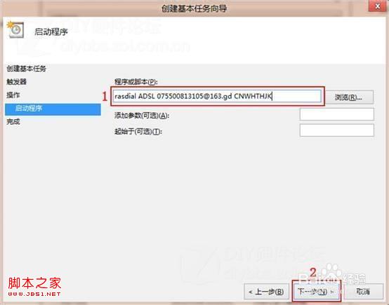 在启动程序或脚本设置界面,在标注“1”位置处键入“rasdial ADSL 075500813105@163.gd CNWHTHJK”,然后在标注“2”处点击“下一步(N)>”按钮。如下图画面所示: