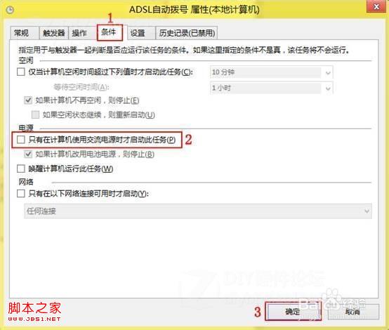 在弹出的属性设置窗口,点击“条件”选项卡,取消勾选“只有在计算机使用交流电源时才启动此任务(P)”,最后点击“确定”按钮结束设置。如下图画面所示: