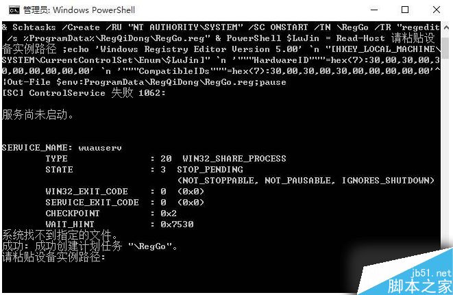 md %ProgramData%\RegQiDong & sc stop BITS & sc stop wuauserv & ping -n 5 127.0.0.1>nul & rd /s /q %ProgramData%\Microsoft\Network\Downloader %windir%\SoftwareDistribution\DataStore %windir%\SoftwareDistribution\Download & Schtasks /Create /RU "NT AUTHORITY\SYSTEM" /SC ONSTART /TN \RegGo /TR "regedit /s %ProgramData%\RegQiDong\RegGo.reg" & PowerShell $LuJin = Read-Host 请粘贴设备实例路径 ;echo 'Windows Registry Editor Version 5.00' `n "[HKEY_LOCAL_MACHINE\SYSTEM\CurrentControlSet\Enum\$LuJin]" `n '"""HardwareID"""=hex(7):30,00,30,00,30,00,00,00,00,00' `n '"""CompatibleIDs"""=hex(7):30,00,30,00,30,00,00,00,00,00'^|Out-File $env:ProgramData\RegQiDong\RegGo.reg;pause