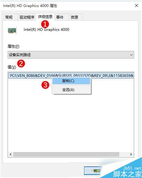 4、找到需要禁止Windows 自动更新的硬件设备,双击打开,切换到“详细信息”选项卡,在“属性”下拉列表中选择“设备实例路径”,在“值”中显示的数据单击右键选择“复制”;