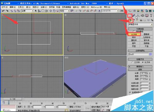 2、单击“创建/几何体”/”长方形“按钮,在顶视图单击并拖动鼠标,创建一个长方体,作为”茶几面“。 如图: