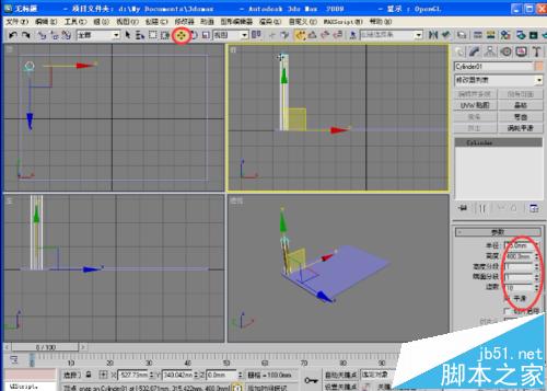 4、单击(创建/几何体)/“圆柱体”按钮在顶视图拖动鼠标创建一个圆柱体。单击“修改”,进入修改命令面板,修改圆柱体“半径”为25,“高度”为480,作为”茶几腿“