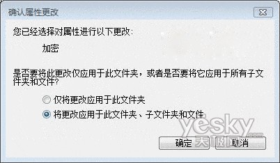 4、在返回的“常规”选项页中点击“确定”,系统将会根据加密文件与文件夹的不同而询问进一步的设置,如加密文件夹时询问是否应用到其下的子文件夹及文件;而加密文件时则会询问是否加密该文件的父文件夹等,根据具体需要选择相应的选项;