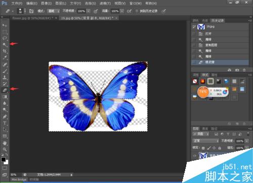 整理素材,将蝴蝶的背景去掉。首先用魔棒工具选择需要擦除的背景元素,再用橡皮擦工具进行擦除。完成之后,保存好背景透明的蝴蝶素材。
