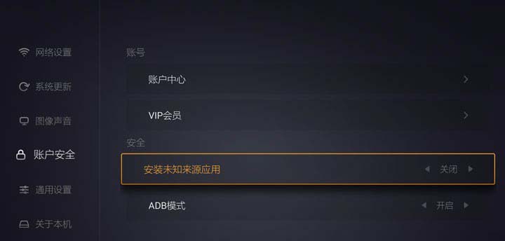 3、找打设置模块以后,按下遥控器的OK键进入设置页面当中,并且移动焦点停留在账户与安全,再向右移动焦点到安装未知来源应用,把状态修改为开启。