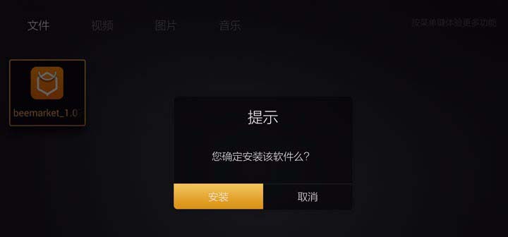 9、焦点在安装文件上时,按下遥控器OK键开始安装之旅。这时候系统会弹出一个安装的弹出窗口界面,选择安装即可。
