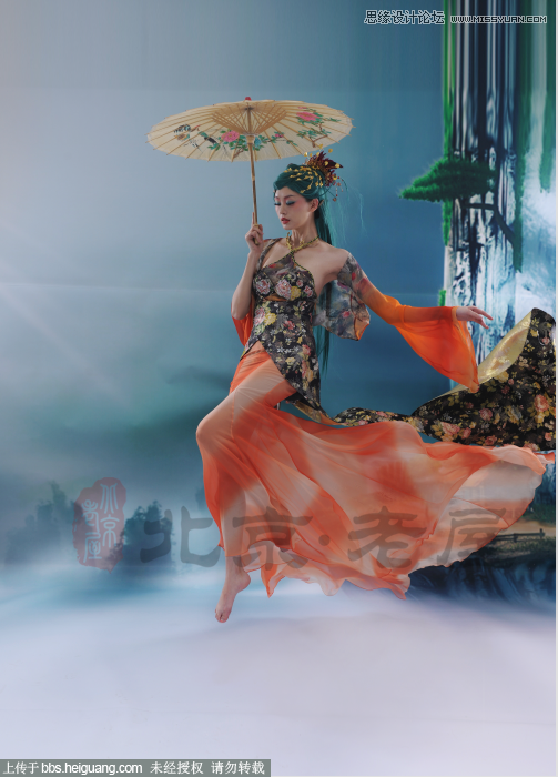 1 首先:拿到片子将片子定调,片子调子为清雅、飘逸、仙境色调。首先将背景进行冷清暖黄处理。