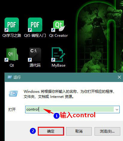 2、在运行窗口中输入 control,再点击“确定”。