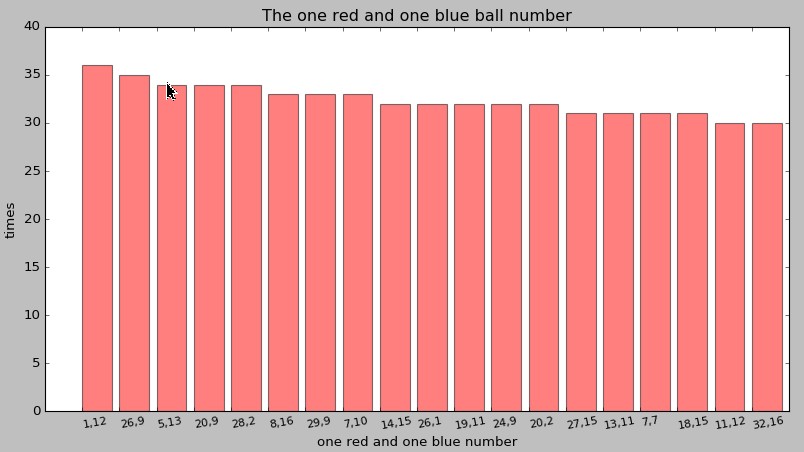 统计单个红球和蓝球,哪个组合最多,显示前19组数据