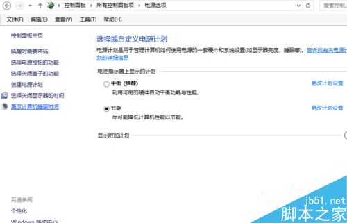 打开电源选项后会看到如下界面,我们会看到左边的选项里有一个 更改计算机睡眠时间。点击它。